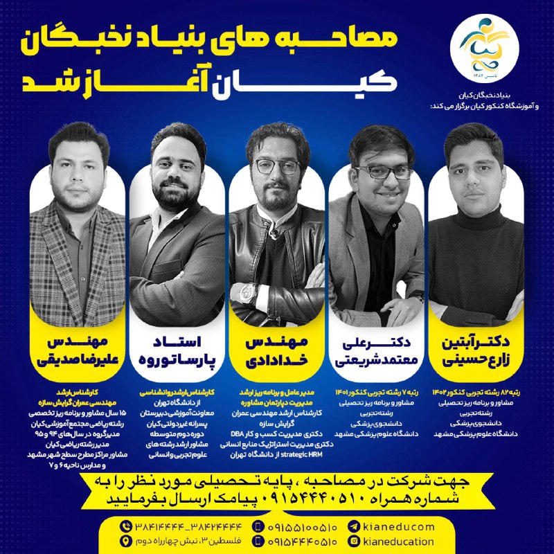 🚀روند مصاحبه های پایه های دهم ، یازدهم و دوازدهم ویژه کنکورهای ۱۴۰۶، ۱۴۰۵ و ۱۴۰۴ به همراه مشاوران ارشد کیان و رتبه برترهای کنکورهای ۱۴۰۱ و ۱۴۰۲ (رتبه ۷ و رتبه ۸۲) آغاز شد