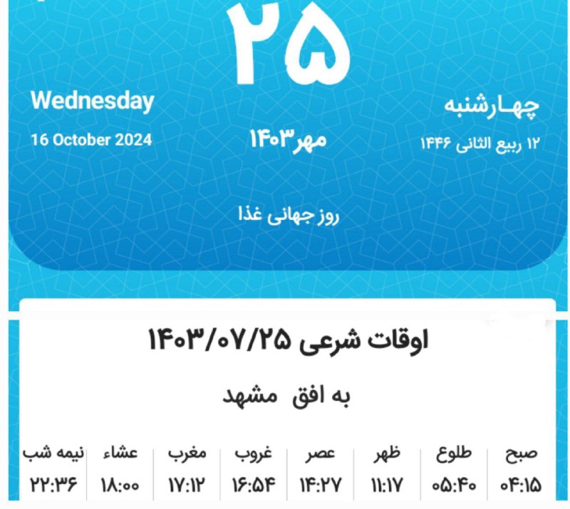 📷اوقات شرعی چهارشنبه بیستوپنجم مهر ماه ۱۴۰۳ به افق مشهد (احتیاط یک تا دو دقیقهای لحاظ شود)