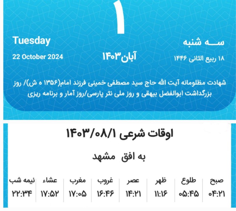 📷اوقات شرعی سهشنبه یکم آبان ماه ۱۴۰۳ به افق مشهد (احتیاط یک تا دو دقیقهای لحاظ شود)
