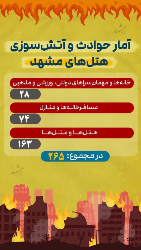 🔸۲۶۵ حادثه آتشسوزی در هتلهای مشهد#اینفوگرافی_اخبارمشهد@AkhbarMashhad Posted on اکتبر 29, 2024 🔸۲۶۵ حادثه آتشسوزی در هتلهای مشهد#اینفوگرافی_اخبارمشهد@AkhbarMashhad