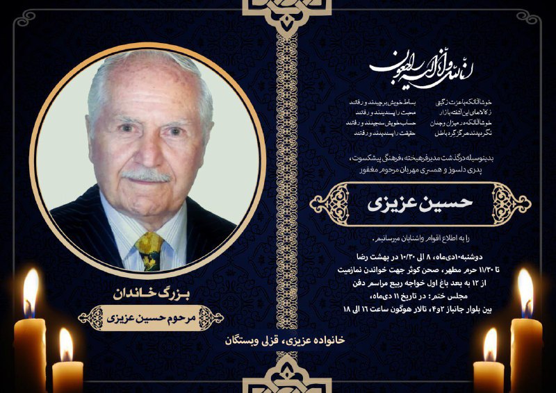 🔹بدینوسیله درگذشت مدیر فرهیخته، فرهنگی پیشکسوت، پدری دلسوز و همسری مهربان مرحوم مغفور “حسین عزیزی” را به اطلاع اقوام و آشنایان می‌رسانیم
