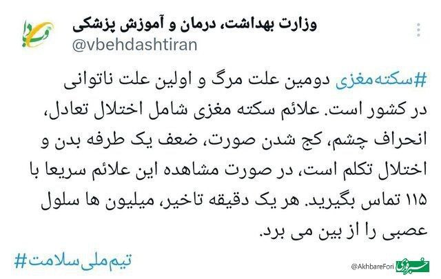 🔹وزارت بهداشت، سکته مغزی را اولین علت ناتوانی در کشور خواند و تاکید کرد که در صورت بروز علایم آن، هر یک دقیقه تاخیر در مراجعه به مرکز درمانی، میلیون‌ها سلول عصبی را از بین می‌برد.