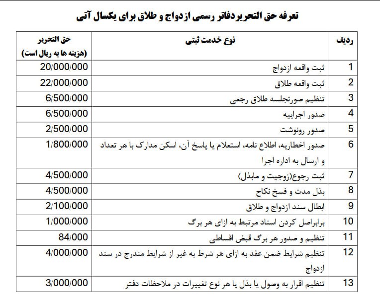 📷تعرفه‌های جدید ثبت ازدواج و طلاق اعلام شد