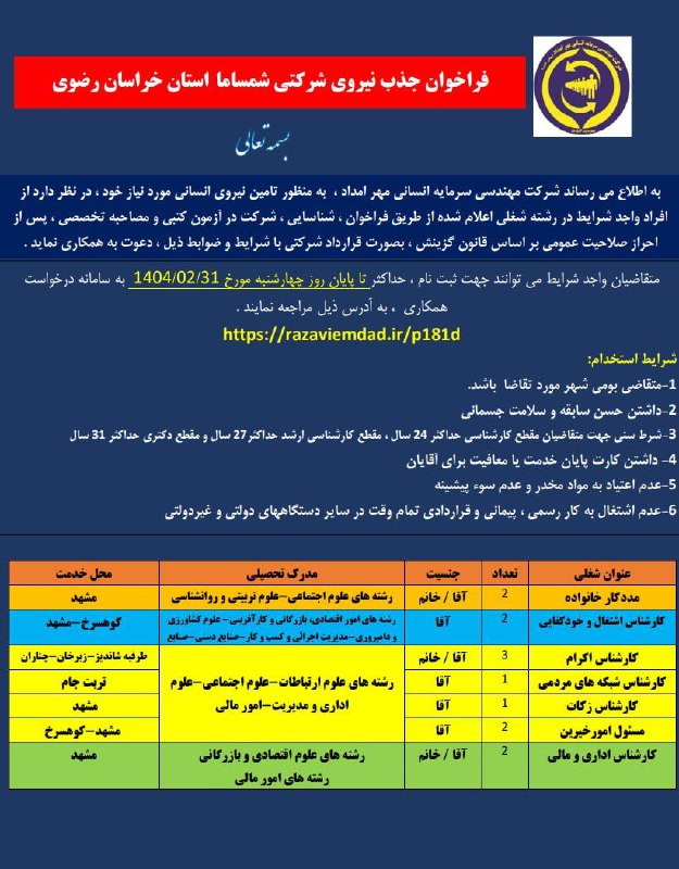 متقاضیان واجد شرایط جهت ثبت نام حداکثر تا پایان روز چهارشنبه مورخ ۳۱ اردیبهشت ۱۴۰۴ به سامانه درخواست همکاری به آدرس ذیل مراجعه نمایند.