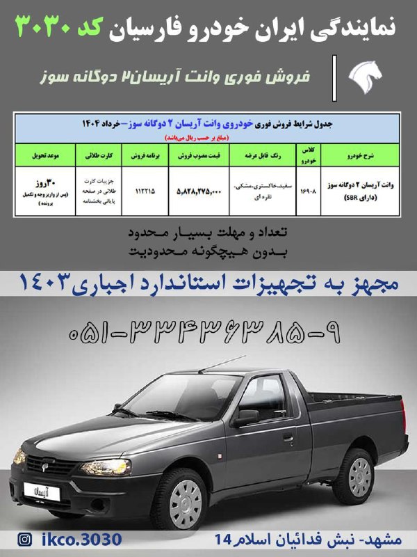 جهت ثبت نام به نمايندگي ايران خودرو فارسیان کد 3030 مراجعه نمايند و یا به صورت غیر حضوری با شماره های نمایندگی تماس حاصل فرمایند.