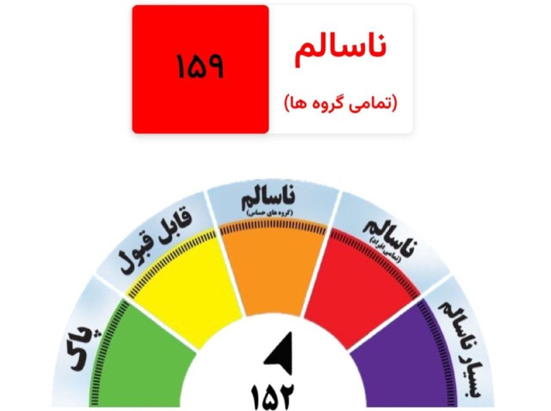 🔹 میانگین شاخص کلی کیفیت هوای مشهد در ۲۴ ساعت گذشته با عدد ۱۵۲ نشانگر هوای ناسالم برای همه است و شاخص هوای این کلانشهر هم در یک تا ۲ ساعت گذشته با عدد ۱۵۹ گویای آلودگی هوا در شرایط بسیار ناسالم است.