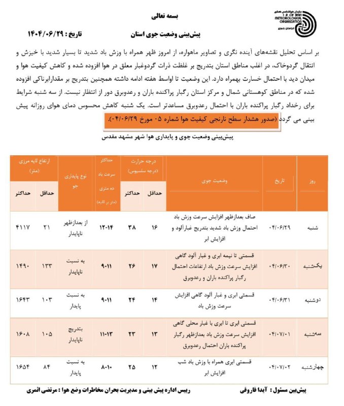📷پیش بینی وضعیت جوی و پایداری هوای مشهد طی Posted on سپتامبر 20, 2025 📷پیش بینی وضعیت جوی و پایداری هوای مشهد طی ۴ روز آینده@AkhbarMashhad
