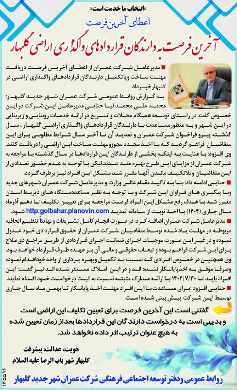 مدیرعامل شرکت عمران شهر جدید گلبهار اعلام کرد که مهلت ثبت‌نام و تکمیل مراحل تا دهم آذرماه ۱۴۰۴ تمدید شده است. در صورت عدم مراجعه، حقوق قراردادی شرکت اعمال خواهد شد.