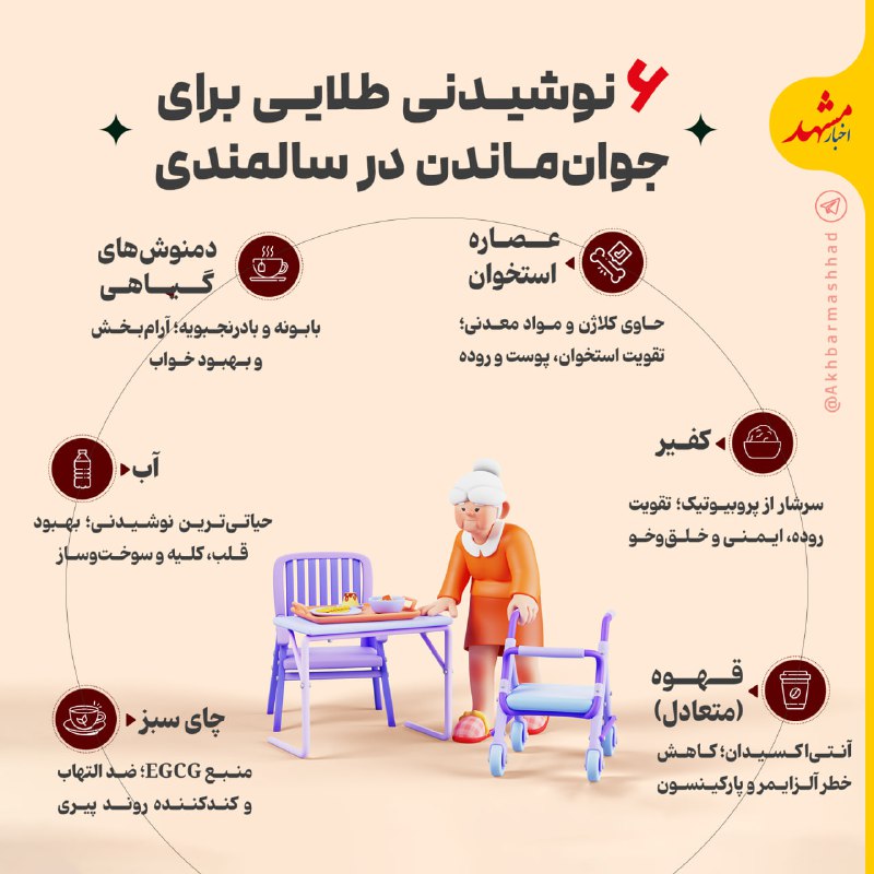 🔸️۶ نوشیدنی طلایی برای جوان ماندن در سالمندی✨️#اینفوگرافی_اخبارمشهد@AkhbarMashhad Posted on سپتامبر 21, 2025 🔸️۶ نوشیدنی طلایی برای جوان ماندن در سالمندی✨️#اینفوگرافی_اخبارمشهد@AkhbarMashhad
