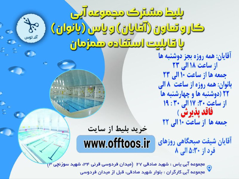 فروش تعدادمحدودی بلیت مشترک استخرکارگران ویاس با اعتبار 1404/7/5 با قیمت 140/000تومان درسایت