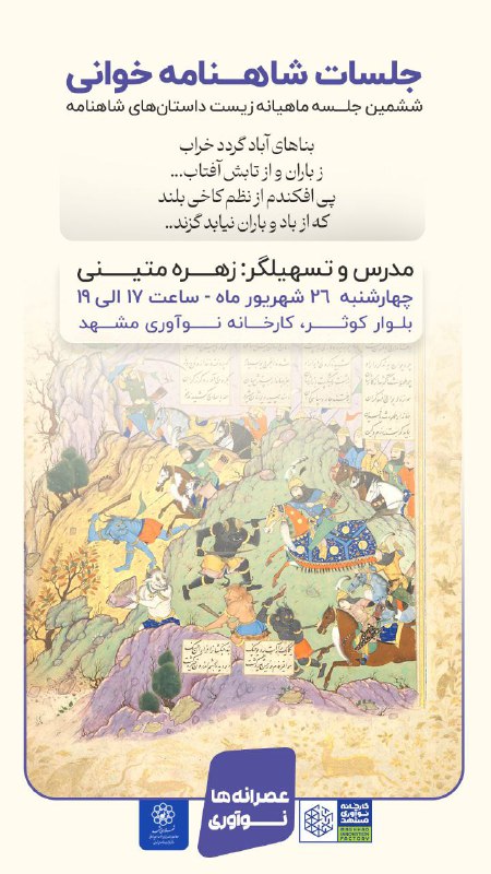 در ادامه جلسات شاهنامه خوانی با مهربانو متینی، در ششمین جلسه  سال ۱۴۰۴ از خوانش و زیست شاهنامه به ساعت اکنون ،به ادامه داستانِ داستان های شاهنامه می‌پردازیم.