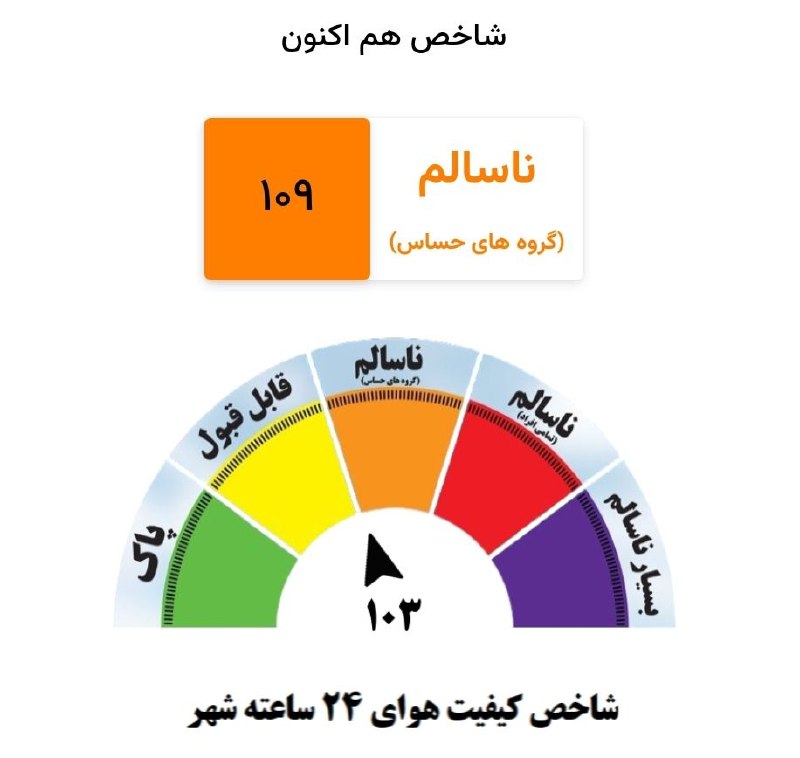 🔹شاخص لحظهای هوای مشهد با عدد ۱۰۹ در شرایط ناسالم قرار گرفته است و در ۲۴ ساعت گذشته نیز کیفیت هوا با عدد ۱۰۳، وضعیت ناسالمی داشته است.