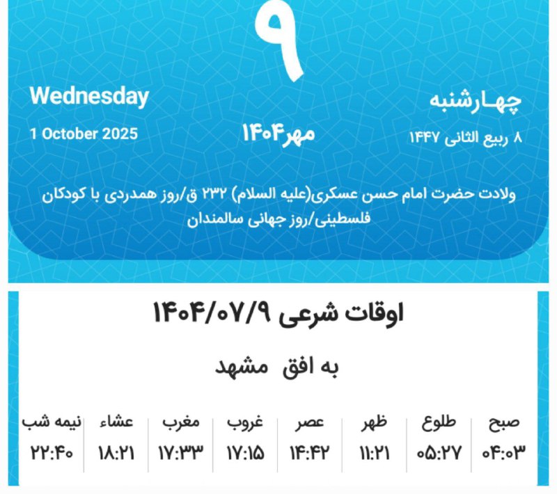 📷اوقات شرعی چهارشنبه نهم مهر ماه ۱۴۰۴ به افق مشهد (احتیاط یک تا دو دقیقهای لحاظ شود)