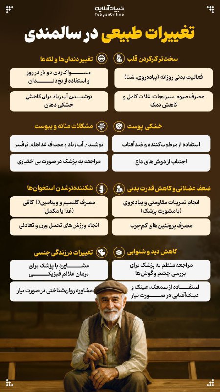 🔹 سالمندی با تغییراتی طبیعی همراه است که می‌توان با مراقبت‌های مناسب با آن‌ها سازگار شد