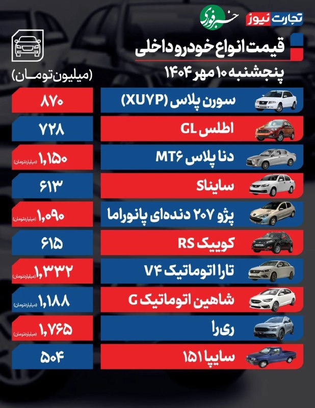 🔸قیمت خودرو امروز ۱۰ مهر ۱۴۰۴ / فرمان بازار Posted on اکتبر 2, 2025 🔸قیمت خودرو امروز ۱۰ مهر ۱۴۰۴ / فرمان بازار خودرو به سمت افزایش قیمت چرخید @AkhbarMashhad