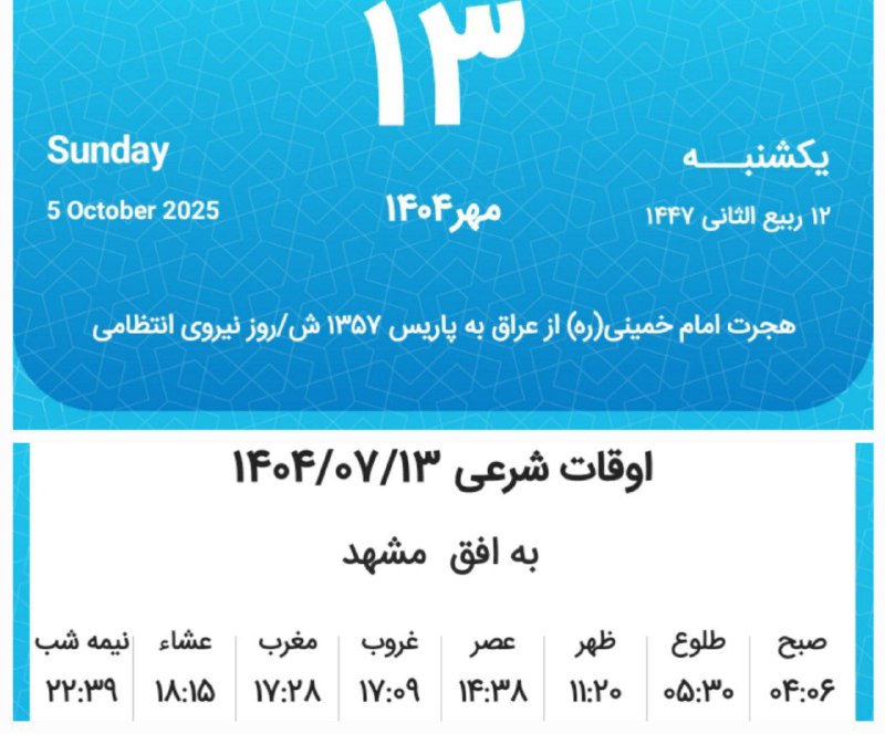 📷اوقات شرعی یکشنبه سیزدهم مهر ماه ۱۴۰۴ به افق مشهد (احتیاط یک تا دو دقیقهای لحاظ شود)