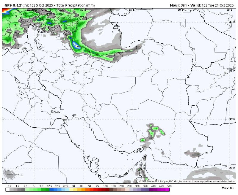 🌧️آپدیت جدید مدل GFS; مجموع بارش طی ۱۶ روز آینده