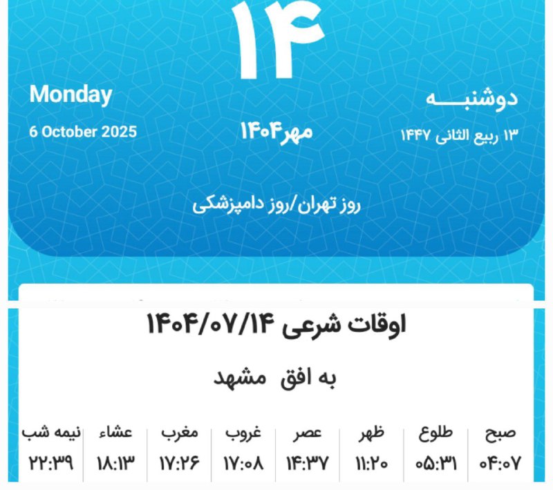 📷اوقات شرعی دوشنبه چهاردهم مهر ماه ۱۴۰۴ به افق مشهد (احتیاط یک تا دو دقیقهای لحاظ شود)