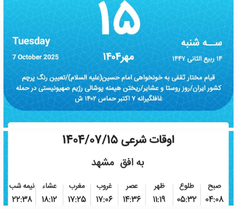📷اوقات شرعی سهشنبه پانزدهم مهر ماه ۱۴۰۴ به افق مشهد (احتیاط یک تا دو دقیقهای لحاظ شود)