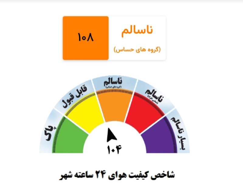 🔹شاخص لحظهای هوای مشهد با عدد ۱۰۸ در شرایط ناسالم برای گروههای حساس قرار گرفته است. در ۲۴ ساعت گذشته کیفیت هوا با عدد ۱۰۴ ، در شرایط ناسالم قرار داشته است.