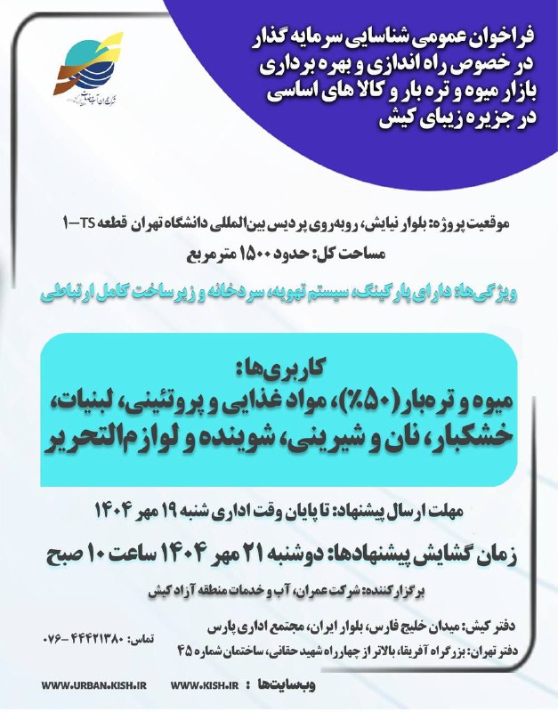 بازار بزرگ میوه، ترهبار و کالاهای اساسی کیش آماده آغاز همکاری با سرمایهگذاران خلاق و توانمند است.