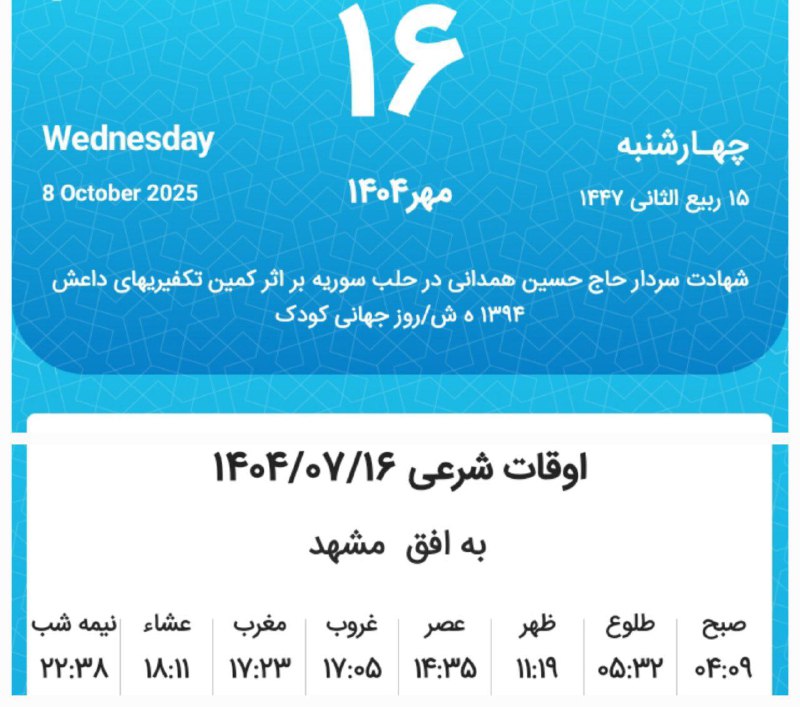 📷اوقات شرعی چهارشنبه شانزدهم مهر ماه ۱۴۰۴ به افق مشهد (احتیاط یک تا دو دقیقه‌ای لحاظ شود)