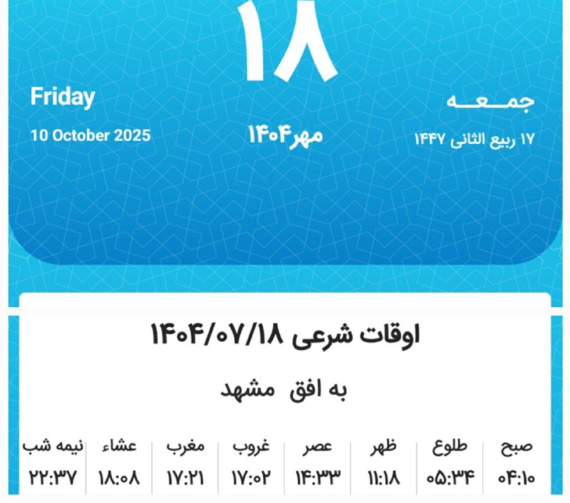 📷اوقات شرعی جمعه هجدهم مهر ماه ۱۴۰۴ به افق مشهد (احتیاط یک تا دو دقیقهای لحاظ شود)