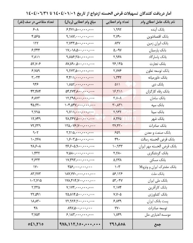 🔹آمار رسمی بانک مرکزی نشان میدهد در ۶ ماهه نخست سال ۱۴۰۴، بیش از ۲۹۱ هزار نفر حدود ۹۸ همت وام ازدواج گرفتند که ۷۵ درصد آن توسط ۶ بانک پرداخت شد