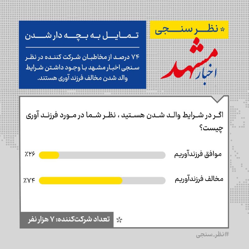 🆔۷۴ درصد از مخاطبان شرکت کننده در نظر سنجی اخبار مشهد با وجود داشتن شرایط والد شدن مخالف فرزند آوری هستند