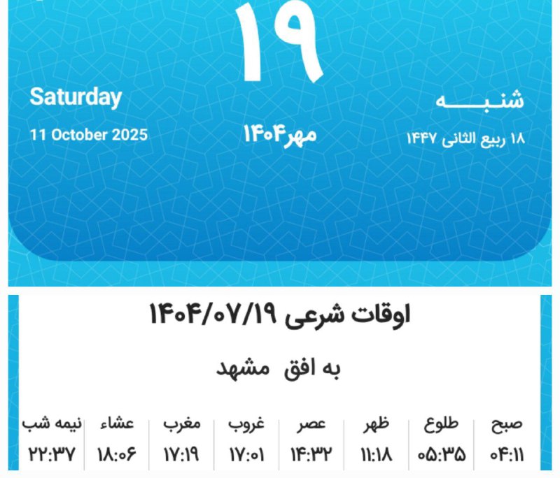 📷اوقات شرعی شنبه نوزدهم مهر ماه ۱۴۰۴ به افق مشهد (احتیاط یک تا دو دقیقه‌ای لحاظ شود)
