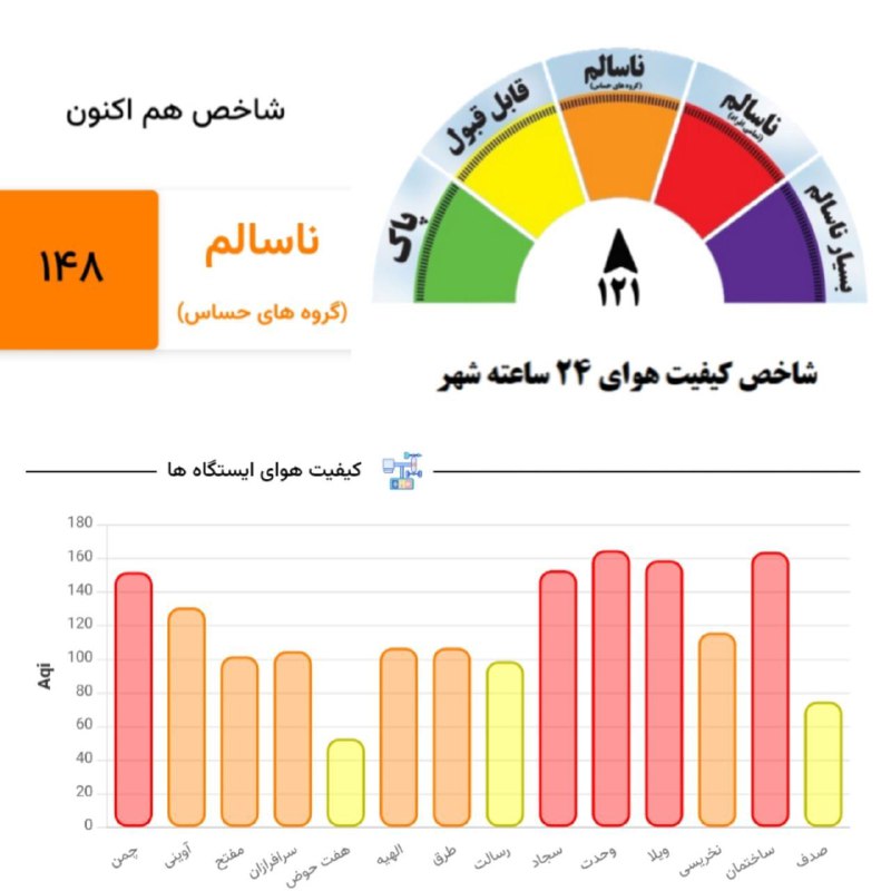 🔹هم‌اکنون شاخص لحظه‌ای هوای مشهد با عدد ۱۴۸ و شاخص ۲۴ ساعت گذشته با عدد ۱۲۱ در وضعیت آلوده برای گروه‌های حساس قرار دارد.