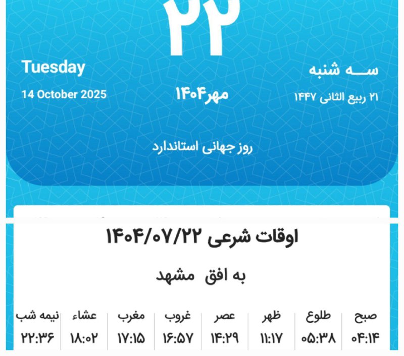 📷اوقات شرعی سهشنبه بیستودوم مهر ماه ۱۴۰۴ به افق مشهد (احتیاط یک تا دو دقیقهای لحاظ شود)