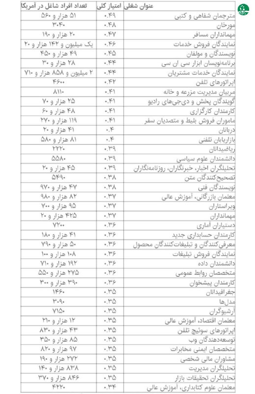 🔹بر اساس تحلیل مایکروسافت از ۲۰۰ هزار مکالمه کاربران آمریکایی، مترجمان (با ۹۸٪ تطابق وظایف با هوش مصنوعی) و مشاغل دانشمحور مانند مورخان و نویسندگان در معرض خطر هستند.