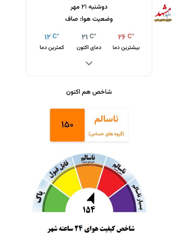 💢هوای مشهد امروز هم طبق روزهای گذشته در وضعیت ناسالم قرار دارد و شاخص کیفیت لحظه ای هوا هم اکنون عدد ۱۵۰ را نشان می دهد.