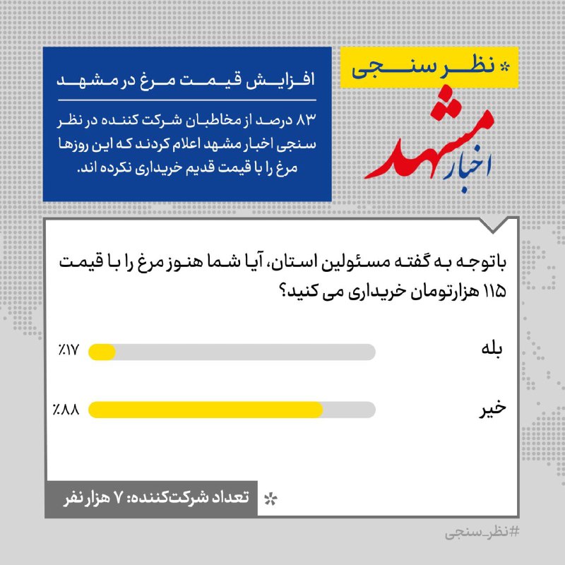 🆔۸۳ درصد از مخاطبان شرکت کننده در نظر سنجی اخبار مشهد اعلام کردند که این روزها مرغ را با قیمت قدیم خریداری نکرده اند.
