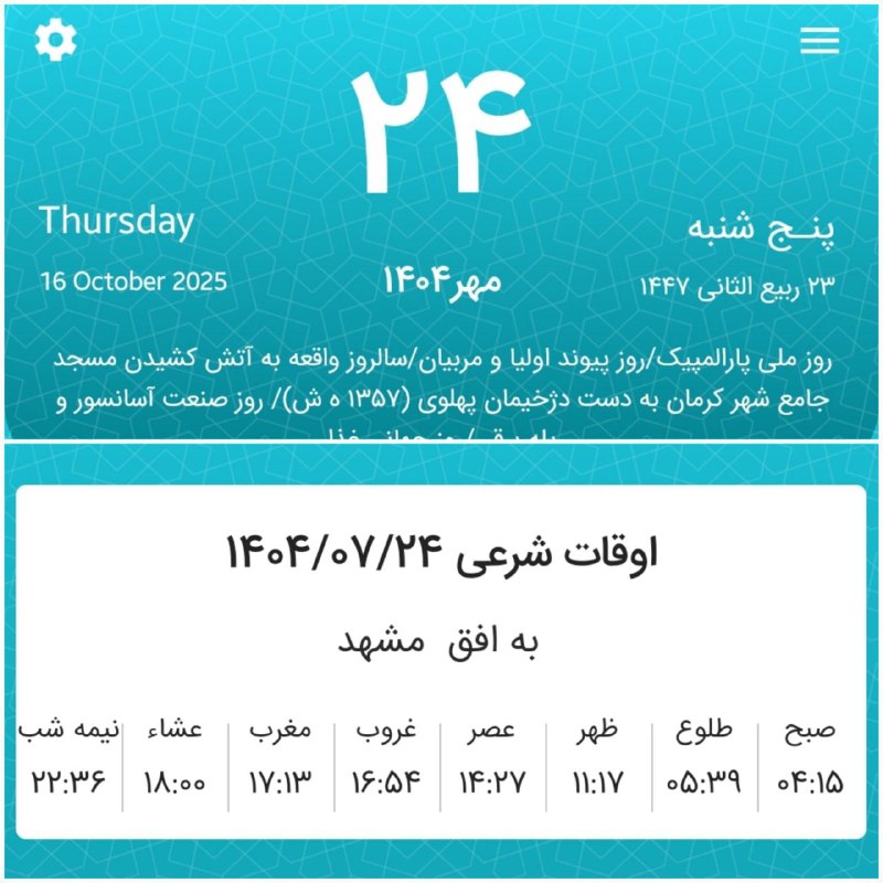 📷اوقات شرعی پنجشنبه بیستوچهارم مهر ماه ۱۴۰۴ به افق مشهد (احتیاط یک تا دو دقیقهای لحاظ شود)