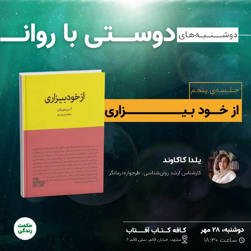 مشهد، بلوار احمدآباد، خیابان قائم، نبش قائم ۴، کافه کتاب آفتاب، طبقه بالا