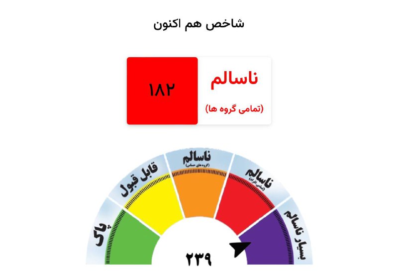 ☠️ کیفیت هوای هم اکنون مشهد با شاخص عددی ۱۸۲ در وضعیت ناسالم برای تمامی افراد قرار دارد.