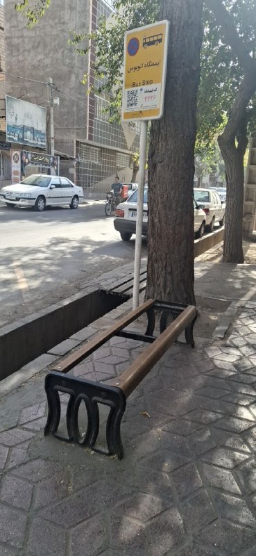 🔹وضعیت صندلی ایستگاه اتوبوس (ون) خطوط ۱۰۵۱ و ۵۶ میدان عسکریه طباطبایی ۱۶ بین قائمی ۲ و ۴. مسافران یا باید بایستند یا به سختی در لبه صندلی بنشینند.