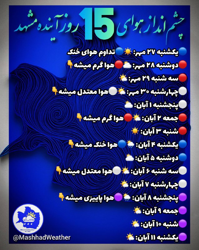 👁️ چشم انداز هوای ۱۵ روز آینده مشهد🍁هواشناسی خصوصی Posted on اکتبر 18, 2025 👁️ چشم انداز هوای ۱۵ روز آینده مشهد 🍁هواشناسی خصوصی مشهد👇 @MashhadWeather