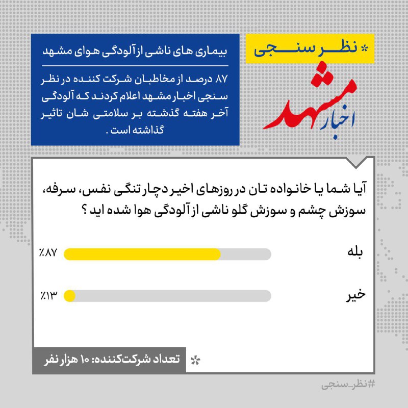 🔹۸۷ درصد از مخاطبان شرکت کننده در نظر سنجی اخبار مشهد اعلام کردند که آلودگی آخر هفته گذشته بر سلامتی شان تاثیر گذاشته است.