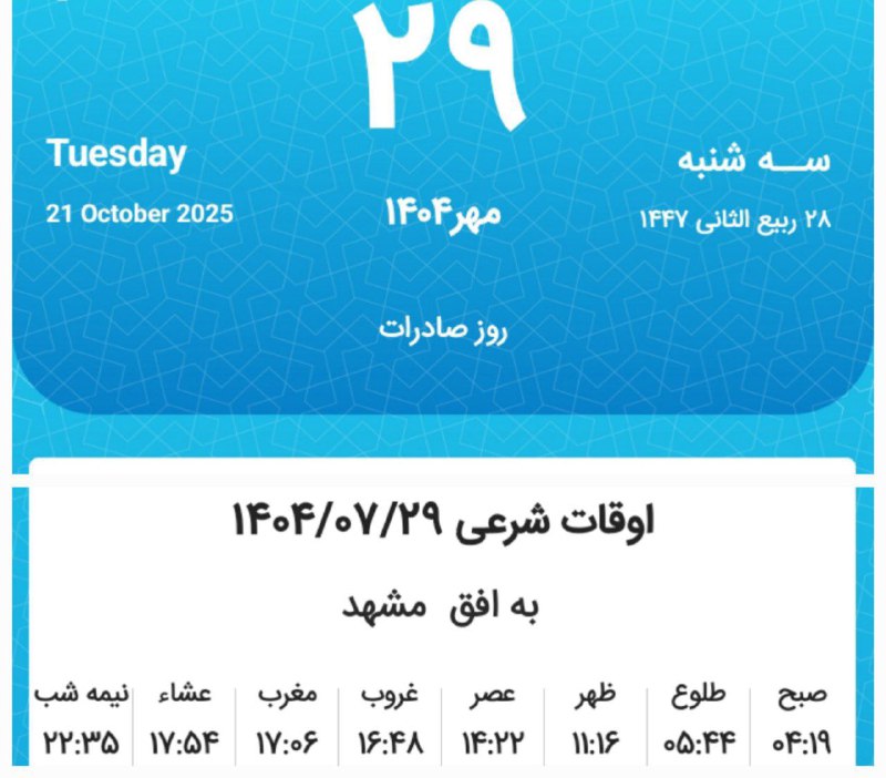 📷اوقات شرعی سهشنبه بیستونهم مهر ماه ۱۴۰۴ به افق مشهد (احتیاط یک تا دو دقیقهای لحاظ شود)