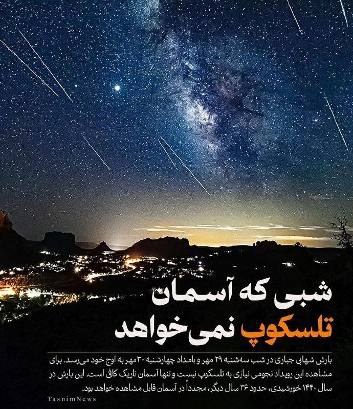 🔸اوج بارش شهابی جبّاری شب سهشنبه ۲۹ مهر و بامداد چهارشنبه ۳۰ مهر قابل مشاهده است.