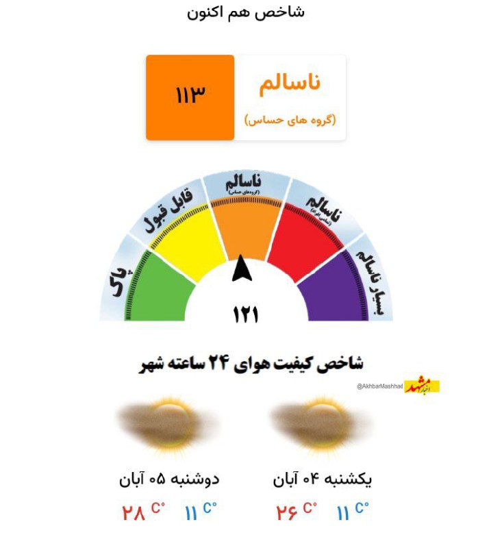 🔹کیفیت هوای مشهد با شاخص لحظهای ۱۱۳ در شرایط ناسالم برای گروههای حساس قرار دارد.