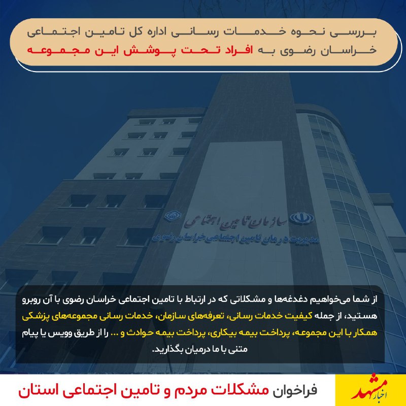 🔸 بررسی نحوه خدمات رسانی اداره کل تامین اجتماعی خراسان رضوی به افراد تحت پوشش این مجموعه.