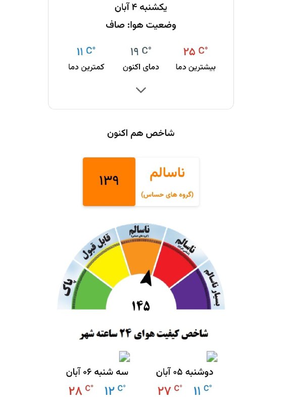 🔹شاخص لحظه‌ای هوای مشهد با عدد ۱۳۹ در شرایط ناسالم قرار گرفته است و در ۲۴ ساعت گذشته نیز کیفیت هوا با عدد ۱۴۵، وضعیت ناسالم داشته است.