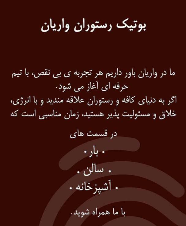 🍽️بوتیک‌رستوران واریان استخدام می‌کند