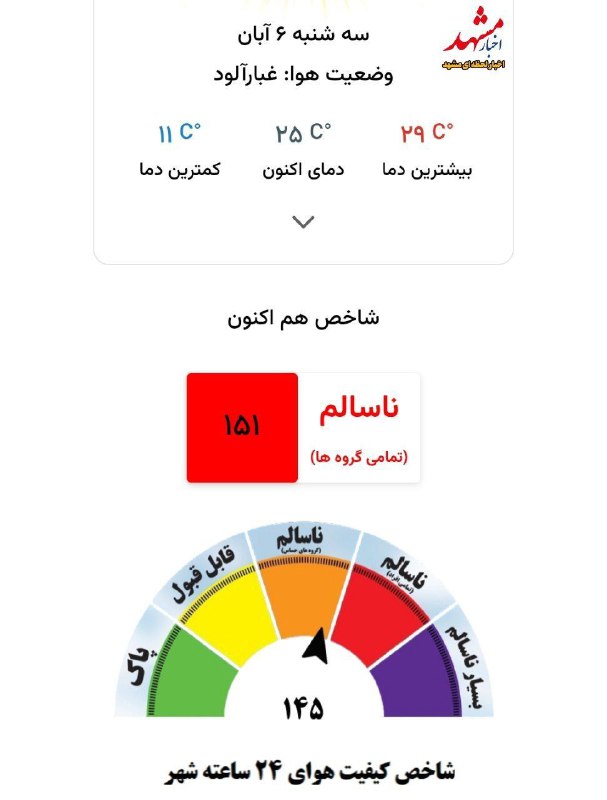 💢هم اکنون شاخص لحظه ای هوای مشهد عدد ۱۵۱ را نشان می دهد و کیفیت هوا برای همه شهروندان ناسالم است.