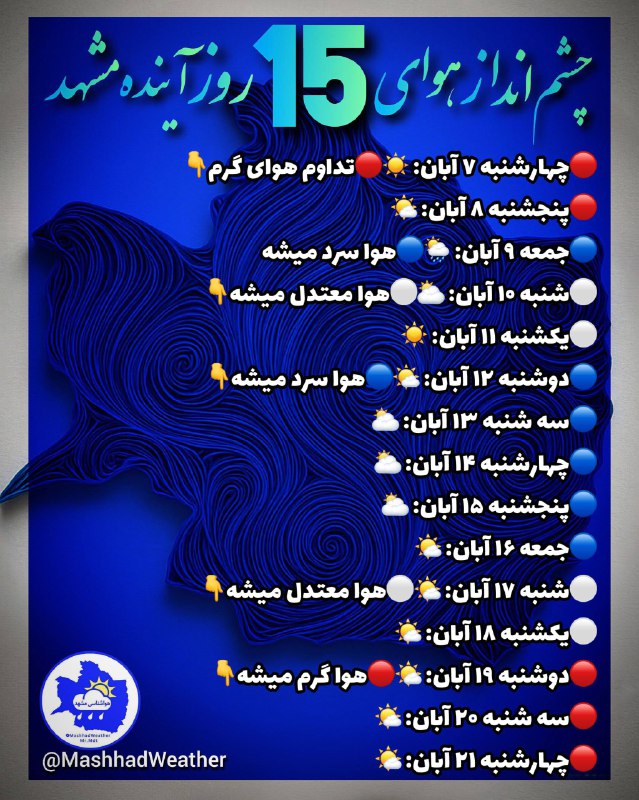 👁️ چشم انداز هوای ۱۵ روز آینده مشهد🍁هواشناسی خصوصی Posted on اکتبر 29, 2025 👁️ چشم انداز هوای ۱۵ روز آینده مشهد 🍁هواشناسی خصوصی مشهد👇 @MashhadWeather