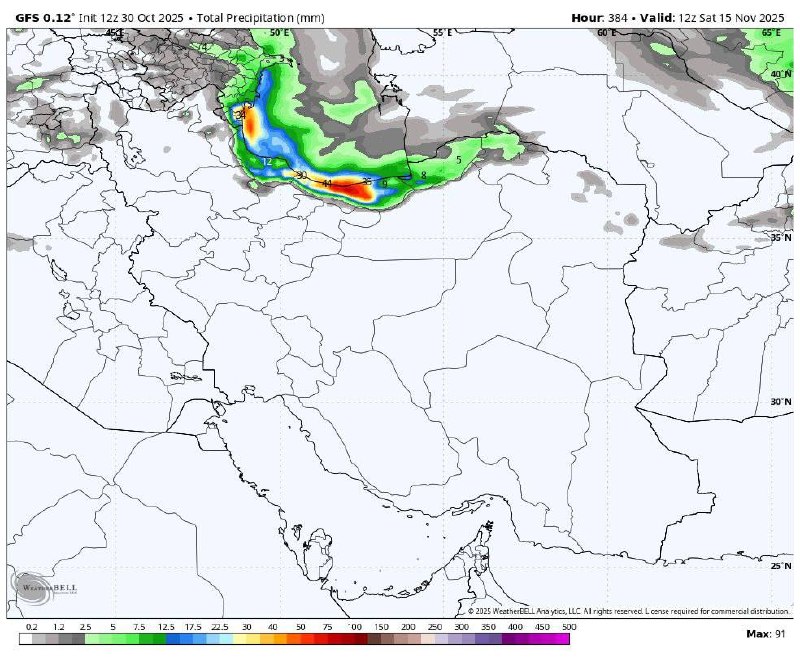 🌧️آپدیت جدید مدل GFS; مجموع بارش طی ۱۶ روز آینده